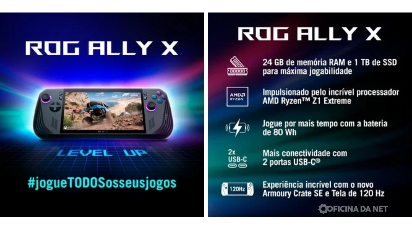 O ROG Ally X, novo console portátil da ASUS, já está disponível no Brasil e promete elevar a experiência de jogo para os fãs da marca. Lançado originalmente em julho, este modelo vem com melhorias significativas em comparação à sua versão anterior, mantendo elementos que já eram bem recebidos, como o processador Ryzen Z1 Extreme da AMD e a tela de 7 polegadas com tecnologia IPS e taxa de atualização de 120 Hz.