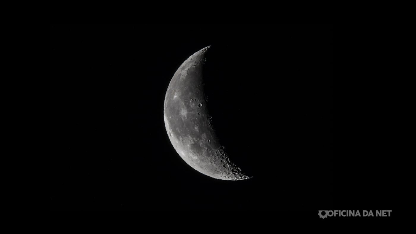 Com 18% iluminado, a Lua ainda é discreta: um fio de luz que só fica evidente em céu limpo e horizonte livre. Ela tem cerca de 4 dias de idade no ciclo atual, crescendo aos poucos e ganhando mais destaque noite após noite.