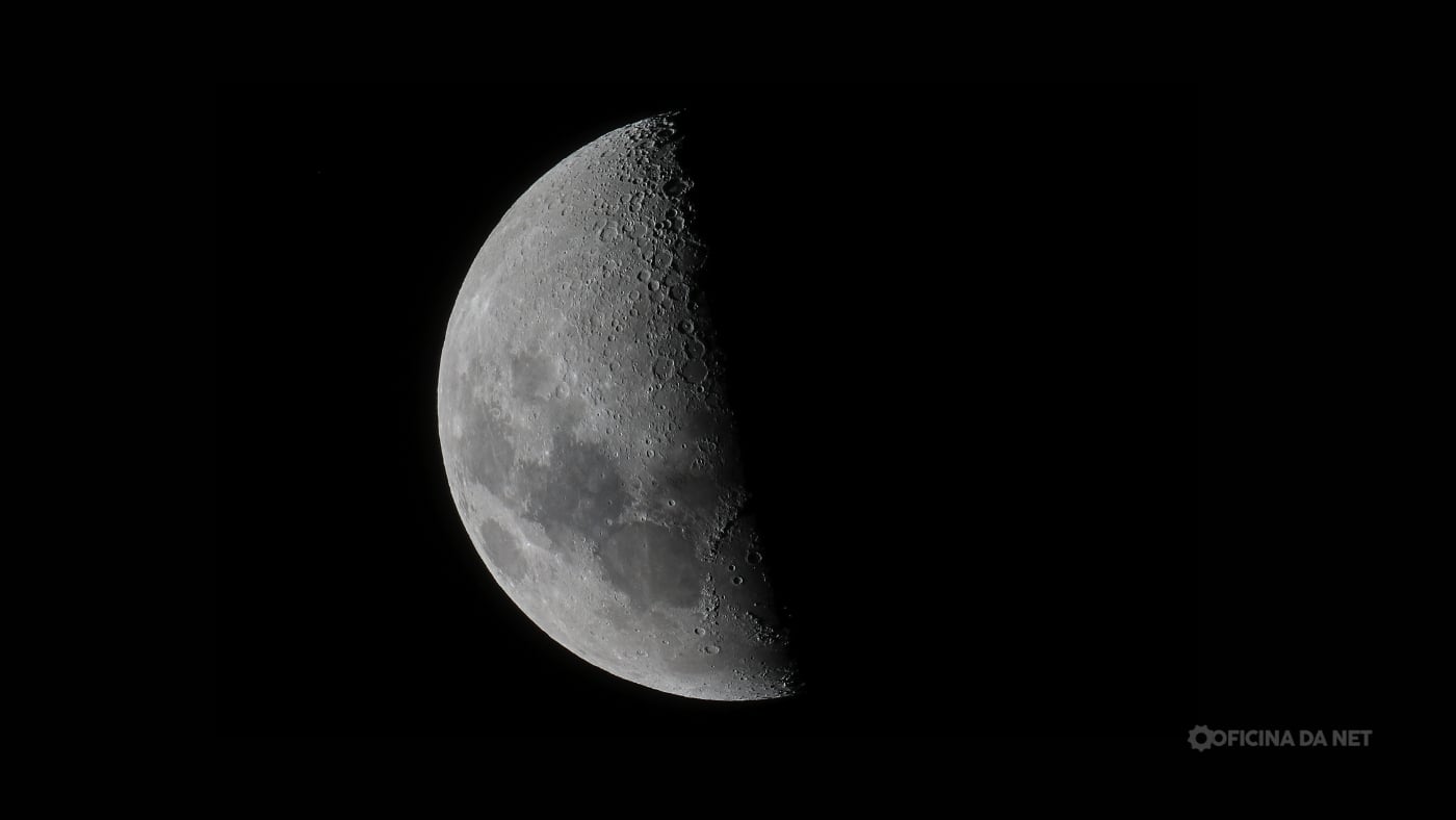 Esse é um ótimo momento para observar o relevo lunar, porque ainda há boa região de contraste entre luz e sombra, mas com grande área iluminada visível.