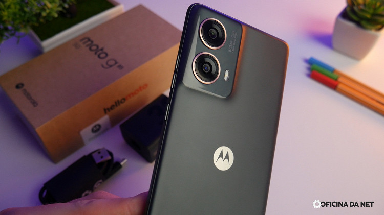 Em nossa análise, testamos a versão com cor cinza-carvão, que traz uma traseira em plástico mais tradicional, embora exista outra variante em azul, que oferece um acabamento em couro vegano que a Motorola costuma colocar em seus aparelhos.