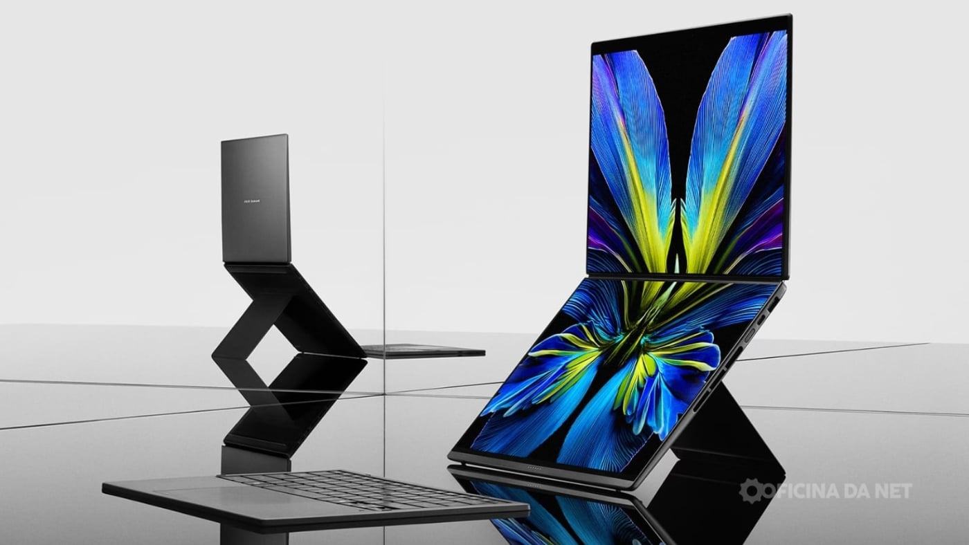 A ASUS também evoluiu o ScreenXpert, software que gerencia o uso das duas telas. Quando o notebook é usado no modo "deitado", o sistema ativa automaticamente ferramentas de compartilhamento, anotações e organização de janelas. Isso significa que arrastar aplicativos entre as telas ficou mais fluido.