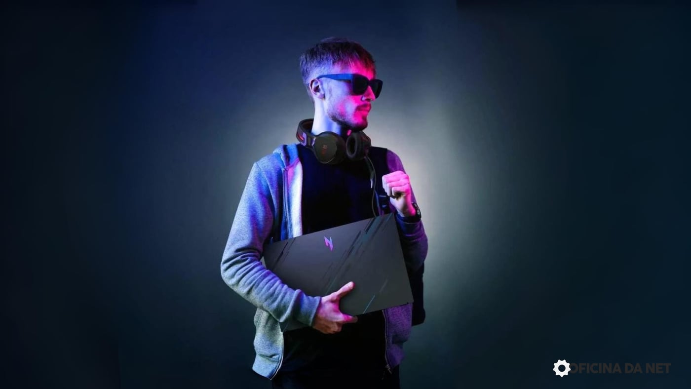 A Acer caprichou no conjunto desse notebook. Por dentro, ele traz um chipset Intel Core i5-13420H de 13ª geração. Essa CPU utiliza a arquitetura híbrida da Intel (núcleos de performance e eficiência), o que garante muito desempenho em jogos sem aquecer tanto em tarefas básicas.