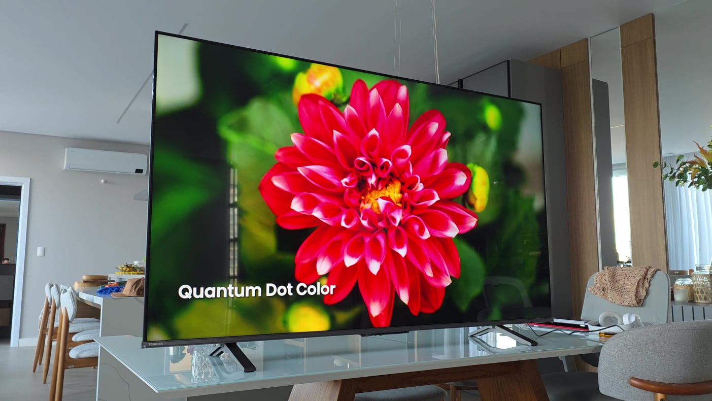 O primeiro destaque está na qualidade de imagem. A TV utiliza um painel QLED 4K, capaz de entregar cores mais puras e maior nível de brilho do que televisores LED tradicionais. Além disso, o suporte a Dolby Vision IQ e HDR10+ permite ajustes dinâmicos de contraste e luminosidade de acordo com a cena exibida, melhorando a percepção de detalhes em filmes e séries, especialmente em ambientes claros.