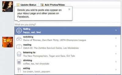 Com os emoticons é possível expressar o que está fazendo na atualização do status. Porém, também é possível complementar as postagens, informando filmes, músicas, etc.